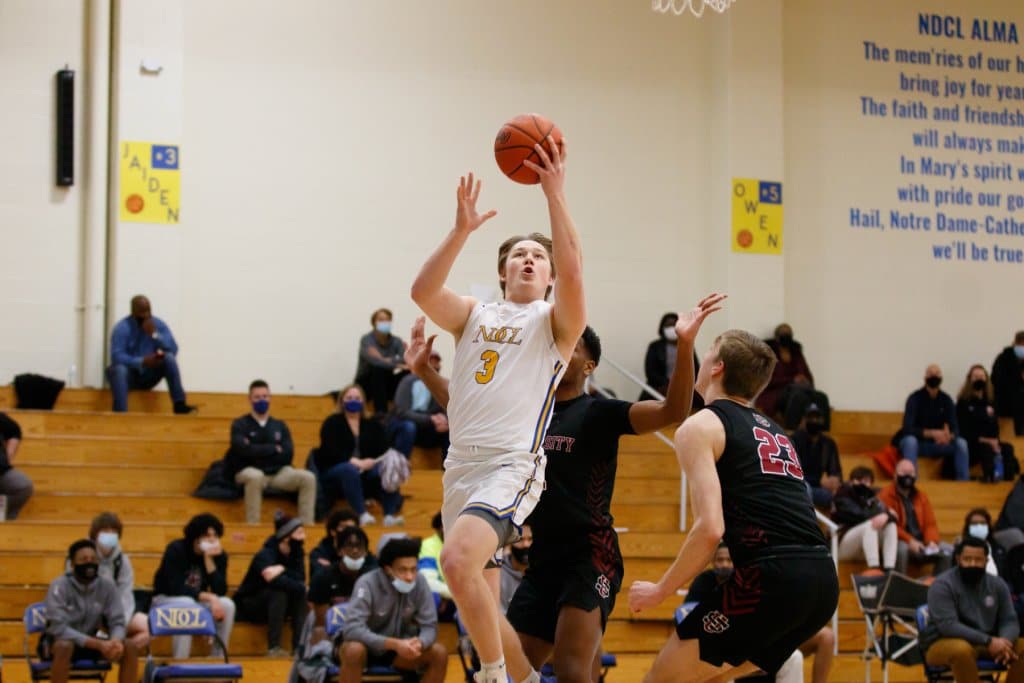 Senior Jaiden Mangelluzzi drives during NDCL’s Senior Night, a night Mangelluzzi scored 13 points in a 62-51 loss to University. The Lions have been affected by COVID-19 with a more than two-week delay at the end of the season. They took on Louisville in a playoff game played after deadline Feb. 23.